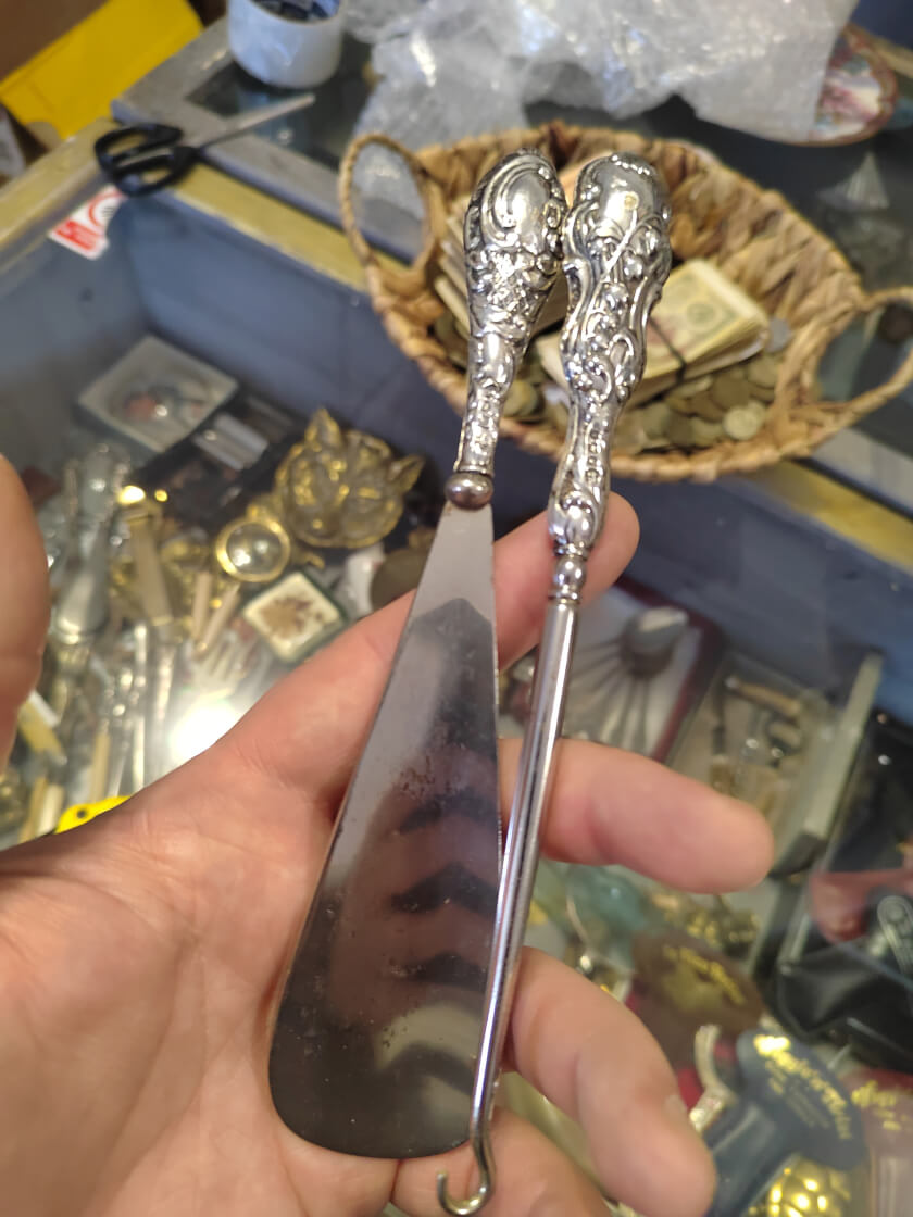 Старинный комплект из ложки / лопатки для обуви и крючка для корсетов. Набор произведен в Англии в конце 19 века. Создан из стерлингового серебра. Стоят клейма от производителя. Оформлен в Викторианском стиле с объемными узорами колокольчиков. Крючок предназначен для удобства в обращении с маленькими и тонкими петельками. Комплект сохранился в прекрасном состоянии. Может активно использоваться в быту по назначению или в декоративных и коллекционных целях. Все лоты выставлены на нескольких площадках поэтому, пожалуйста, перед покупкой уточняйте наличие.