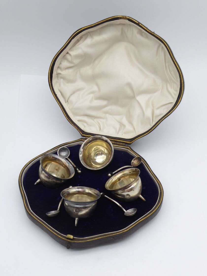 Старинный набор из 4 форм для соли, сахара, специй. Идут в комплекте с четырьмя родными ложками. Комплект создан в 1885 году в Шеффилде, Англия, стоят клейма от производителя. Произведен из стерлингового серебра. Лежит в родном кейсе на синем бархате. Формы стоят на маленьких ножках. Сохранились в прекрасном состоянии, могут активно использоваться в быту. Станут восхитительным элементом сервировки стола и кухонного декора. Все лоты выставлены на нескольких площадках поэтому, пожалуйста, перед покупкой уточняйте наличие.