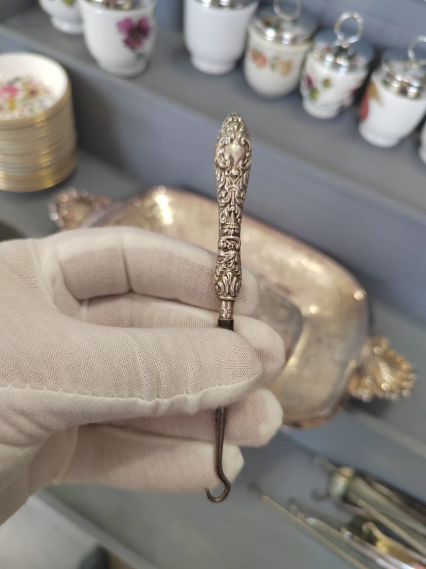 Антикварный крючок для кодлеров под яйца пашот. Произведен в Англии в конце 19 века. Создан из стерлингового серебра. Стоят клейма от производителя. Оформлен в Викторианском стиле с объемными витиеватыми узорами. Предназначен для погружения и изъятия фарфоровых кодлеров из воды. Сохранился в прекрасном состоянии. Может активно использоваться в быту по назначению или в декоративных и коллекционных целях. Все лоты выставлены на нескольких площадках поэтому, пожалуйста, перед покупкой уточняйте наличие.