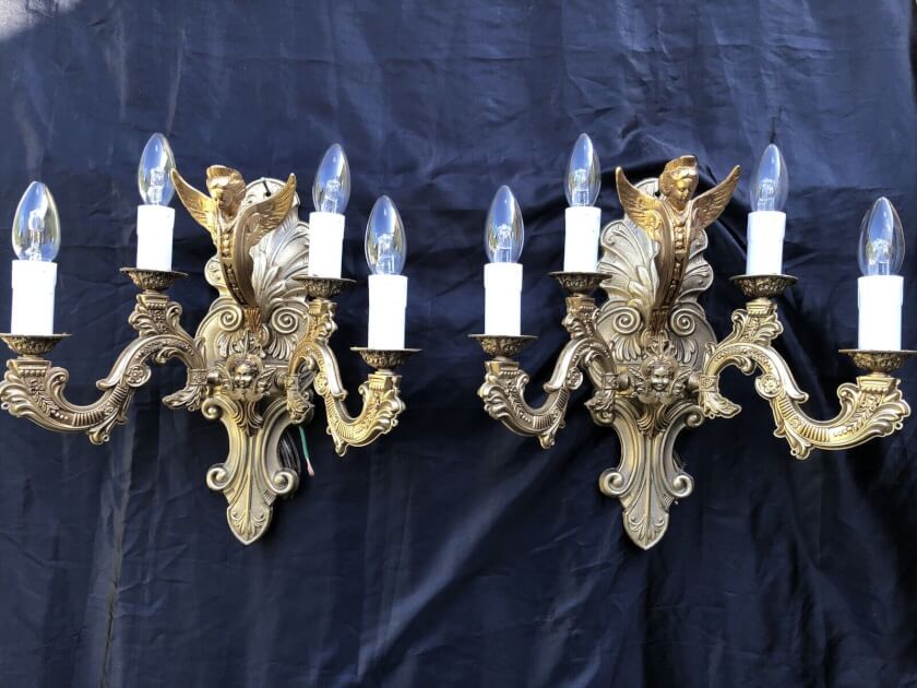 Прекрасная пара настенных бра. Созданы в стиле французского Людовика XVI. Произведены из тяжёлой латуни в Англии в первой половине 20 века. Каждое бра с четырьмя отходящими светильниками. Украшены объёмными фигурками маленьких Ангелов Херувимов с распахнутыми крыльями и массивными резными узорами. Бра сохранились в прекрасном состоянии, блестят. Могут использоваться по назначению. Станут элегантным украшением интерьера комнаты, привнесут в помещение винтажного шика и утонченности. Все лоты выставлены на нескольких площадках поэтому, пожалуйста, перед покупкой уточняйте наличие.