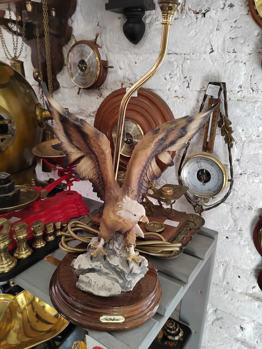Винтажная настольная лампа середины 20 века. Создана в Италии на мануфактуре знаменитого скульптора Белькари (Belcari). Произведена из матового бисквитного фарфора. Стоит на деревянном основании. Имеет клеймо и подпись автора. Оформлена в виде большой фигурки грациозного орла с распахнутыми крыльями. Лампа сохранилась в хорошем состоянии, работает. Может активно использоваться в быту по назначению или станет интересным элементом декора интерьера. Привнесет в помещение шика и винтажной элегантности. Имеет незначительную реставрацию, поэтому цена снижена. Все лоты выставлены на нескольких площадках поэтому, пожалуйста, перед покупкой уточняйте наличие.