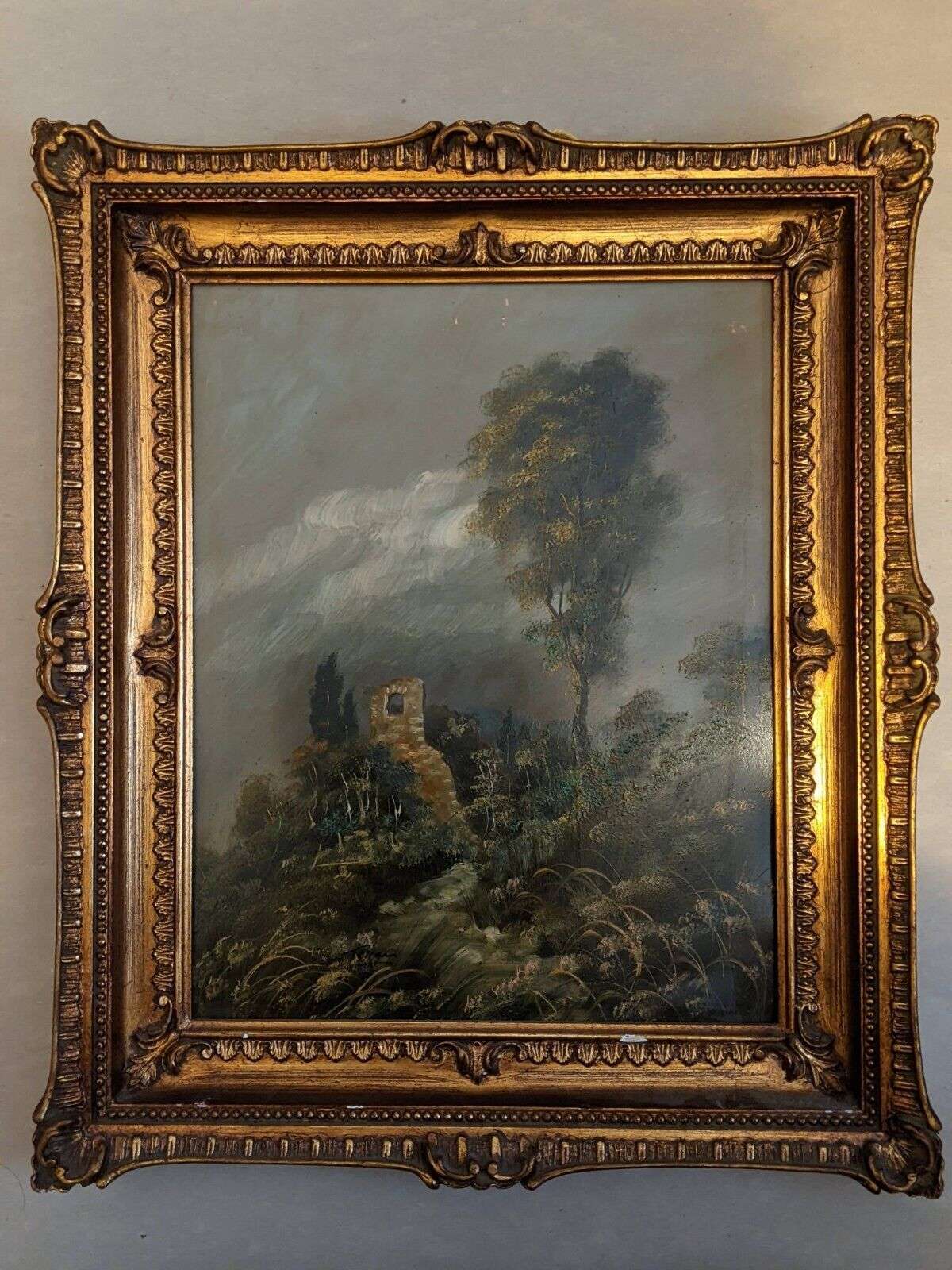 Великолепная оригинальная картина начала 20 века. Написана маслом итальянским художником Телланом. Подпись создателя находится внизу слева. Изображает туманный сентябрьский день и руины старинного замка в зарослях. Картина сохранилась в прекрасном состоянии. Обрамлена в богато украшенную позолоченную раму английского производства. Станет интересным элементом декора комнаты или статусным подарком для любителя живописи. Размер по раме: 40см × 35см.