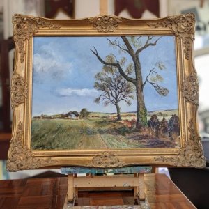 Великолепная картина 20 века. Написана маслом. Натюрморт носит название «Натюрморт с цветами». Подпись художника находится внизу справа. На картине представлен пышный букет свежих нежно-розовых роз, аккуратно размещенный в небольшой коричневой вазе на столе. Картина сохранилась в прекрасном состоянии. Обрамлена в овальную раму английского производства. Станет интересным элементом декора комнаты или частью коллекции для любителя живописи. Все лоты выставлены на нескольких площадках поэтому, пожалуйста, перед покупкой уточняйте наличие.