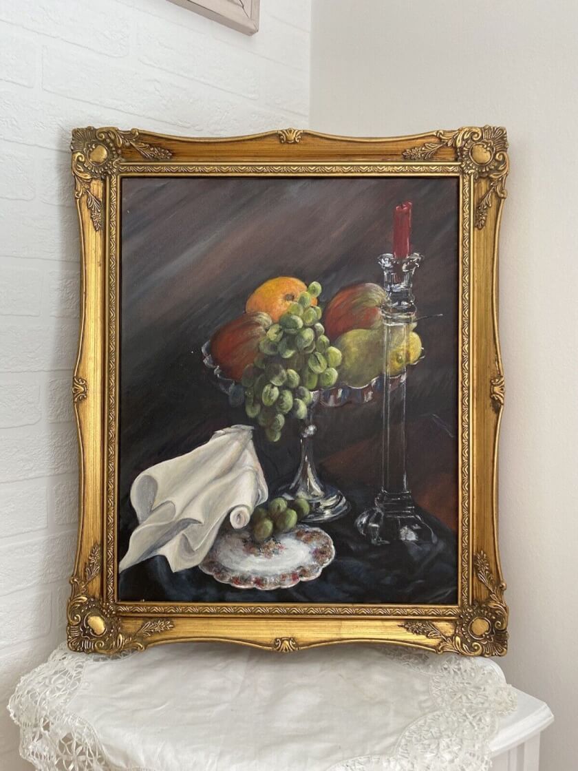Великолепная оригинальная картина 20 века. Написана маслом на холсте. На холсте изображен натюрморт с яркими сочными фруктами и подсвечником на темном фоне. Художник использовал контрастные цвета, чтобы придать картине античности и антуражности. Картина сохранилась в прекрасном состоянии. Обрамлена в богато украшенную позолоченную раму английского производства. Станет интересным элементом декора комнаты или статусным подарком для любителя живописи. Размер по раме: 48см × 61см.
