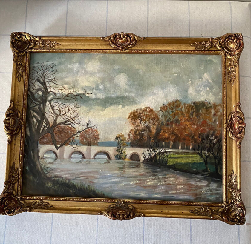 Оригинальная картина 20 века. Написана маслом. На полотне изображен пейзаж поздней осени и мост через реку. Пожелтевшие листья деревьев отражаются в воде, а над всем плывут массивные густые облака. Картина сохранилась в прекрасном состоянии. Обрамлена в богато украшенную позолоченную раму английского производства. Станет интересным элементом декора комнаты или статусным подарком для любителя живописи. Размер по раме: 35см × 46см.