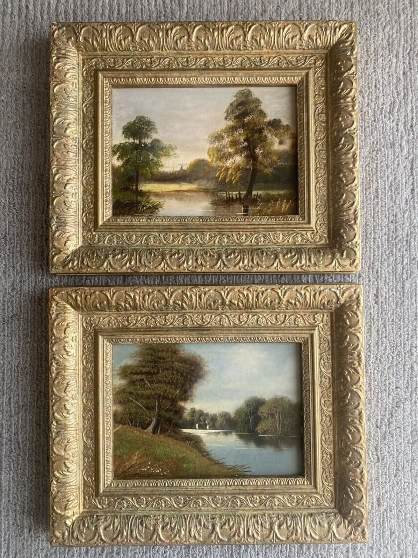 Старинные парные картины с изображением лесных пейзажей. Написаны маслом в Англии в первой половине 20 века. Подпись автора в нижнем левом углу. Пейзажи сохранились в прекрасном состоянии. Обрамлены в великолепные позолоченные рамы. Станут интересным элементом декора интерьера или частью коллекции живописи. Размер по раме: 37 см на 30 см. Все лоты выставлены на нескольких площадках поэтому, пожалуйста, перед покупкой уточняйте наличие.