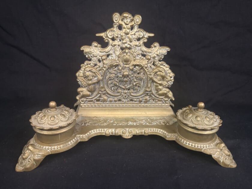 Французский винтажный держатель для писем с двумя чернильницами по бокам. Создан во Франции в первой половине 20 века из латуни. Изделие в стиле барокко: с характерным золотым цветом и величием церковной тематики. Большая спинка изделия украшена Ангелами Херувимами и витиеватыми узорами. Подставка для писем сохранилась в отличном состоянии, может использоваться по назначению для хранения почты и канцелярских мелочей или в декоративных целях. Высота 20см, ширина спереди 30см. Все лоты выставлены на нескольких площадках поэтому, пожалуйста, перед покупкой уточняйте наличие.