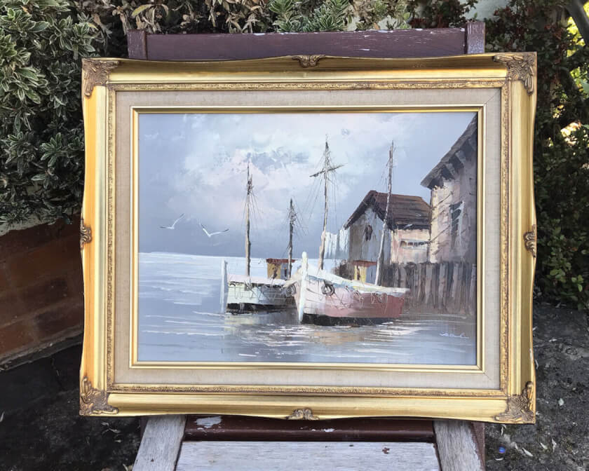 Великолепная картина 20 века. Написана маслом на холсте. Подпись создателя «A. Dakin» находится в правом нижнем углу. На холсте представлены рыбацкие лодки, пришвартованные в гавани, и пару домиков на берегу. Картина сохранилась в прекрасном состоянии. Обрамлена в богато украшенную раму английского производства. Станет интересным элементом декора комнаты или статусным подарком для любителя живописи. Размер по раме: 51см × 41см.